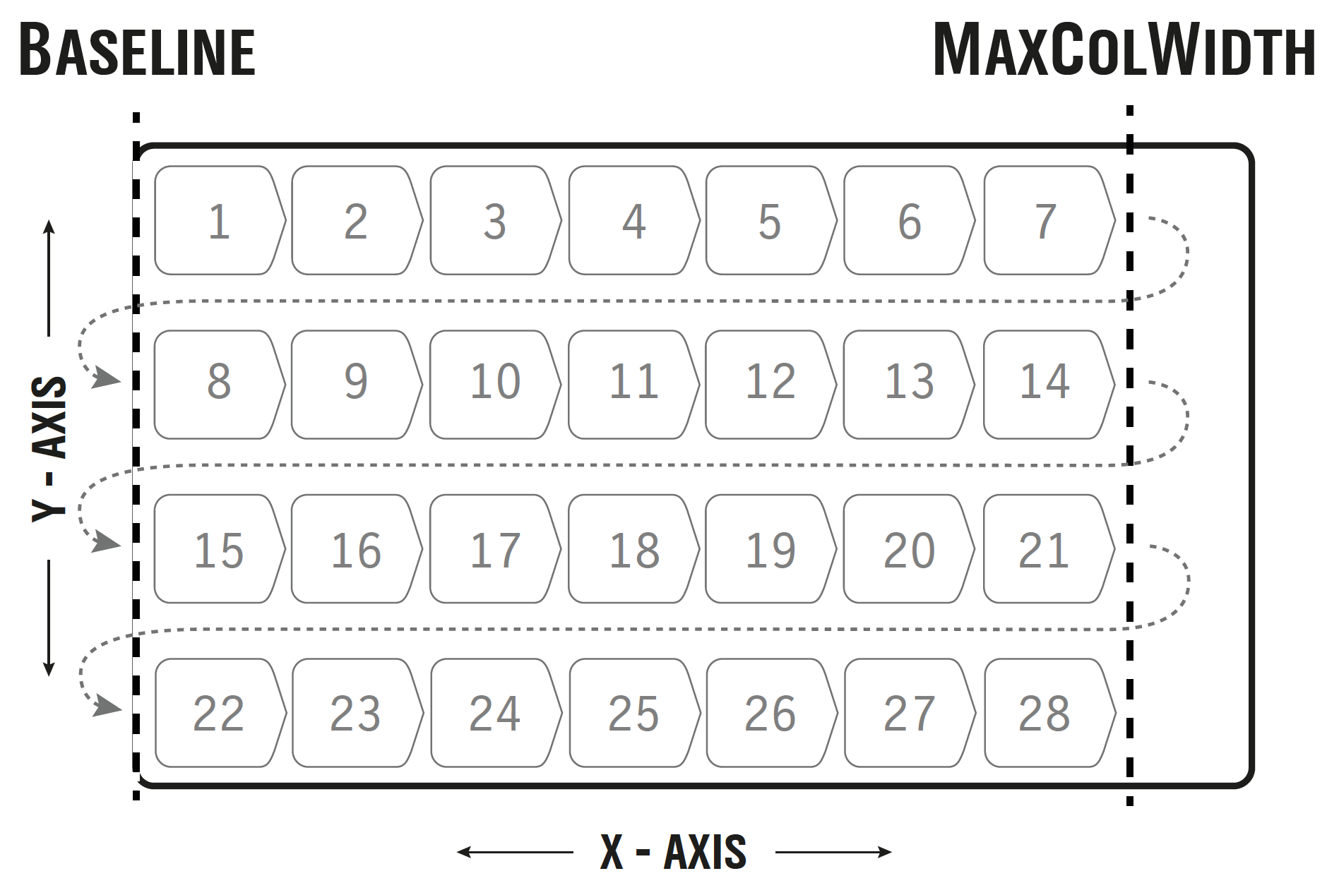 Jede Anzeigefläche ist mit der linke Seite an der vorherigen Anzeigenfläche ausgerichtet. Bei der Berechnung der Position wird der Y-Wert, also die vertikale Positionierung, solange beibehalten bis ein Zeilenumbruch erfolgen muss. Mit dem Zeilenumbrucht die die Anzeige um seine Höhe nach unten veschoben und wieder neu links mit X = 0 angesetzt. Es gibt grundsätzlich 3 Werte um eine Anzeigenfläche direkt an eine andere Position zu bewegen: