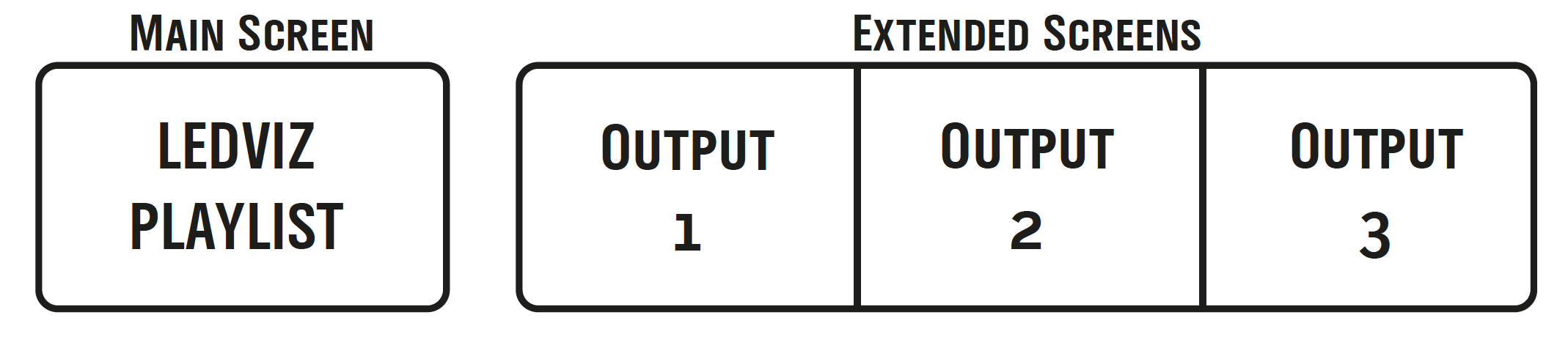 Als Hardwarelösung kann hier eine Matrox TripleHead2Go oder DualHead2Go zum Einsatz kommen. Durch die Extender von Matrox wird die Auflösung an einem DVI / HDMI oder DSP Anschluss erweitert und anschließend wieder in einzelne Bildschirm Signale aufgeteilt. Alternativ, wenn die Grafikkarte mehrere Ausgänge hat, kann das Ausgabefenster von LEDVIZ auch in der Höhe oder Breite geändert werden, so das es die komplette Ausgabe ausfüllt.
